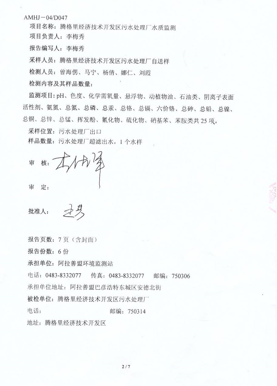 2015年9月21日,受騰格里經(jīng)濟(jì)技術(shù)開發(fā)區(qū)污水處理廠委托,阿拉善盟環(huán)境監(jiān)測站對園區(qū)內(nèi)水廠出水水樣進(jìn)行分析,出具水質(zhì)監(jiān)測報告,報告顯示,騰格里污水處理廠外排廢水執(zhí)行《城鎮(zhèn)污水處理廠污染物排放標(biāo)準(zhǔn)》(GB18918-2002)表1中一級標(biāo)準(zhǔn)A標(biāo)準(zhǔn)(mg/l)。污水處理廠超濾出水水樣25項指標(biāo)均滿足《城鎮(zhèn)污水處理廠污染物排放標(biāo)準(zhǔn)》(GB18918-2002)表1中一級標(biāo)準(zhǔn)A標(biāo)準(zhǔn)(mg/l)。