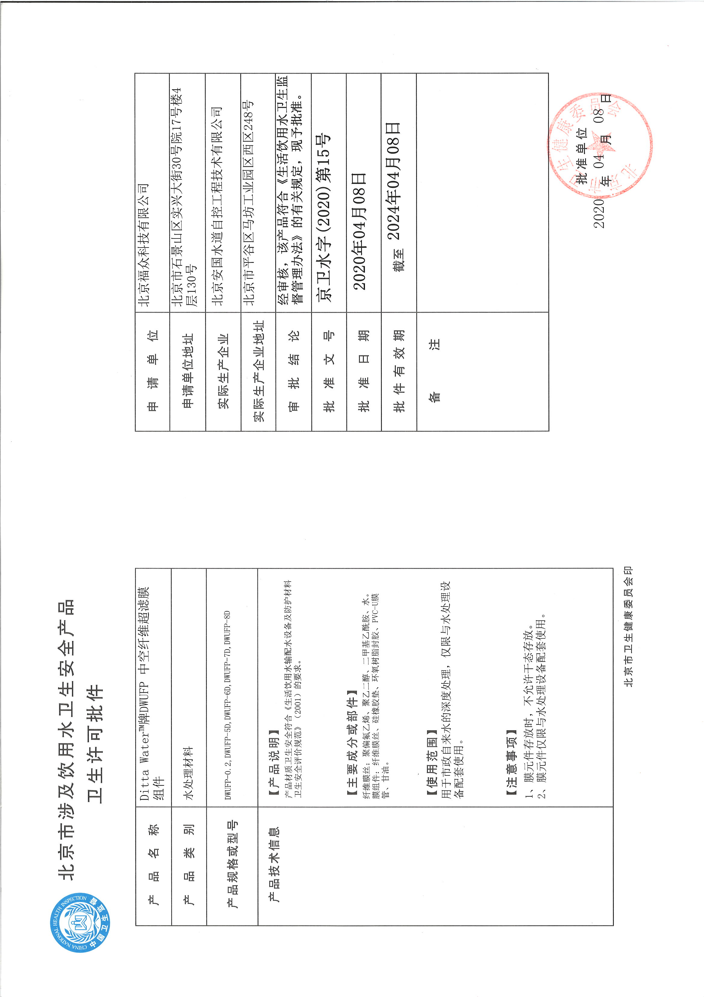 涉水證明--中空纖維超濾膜組件