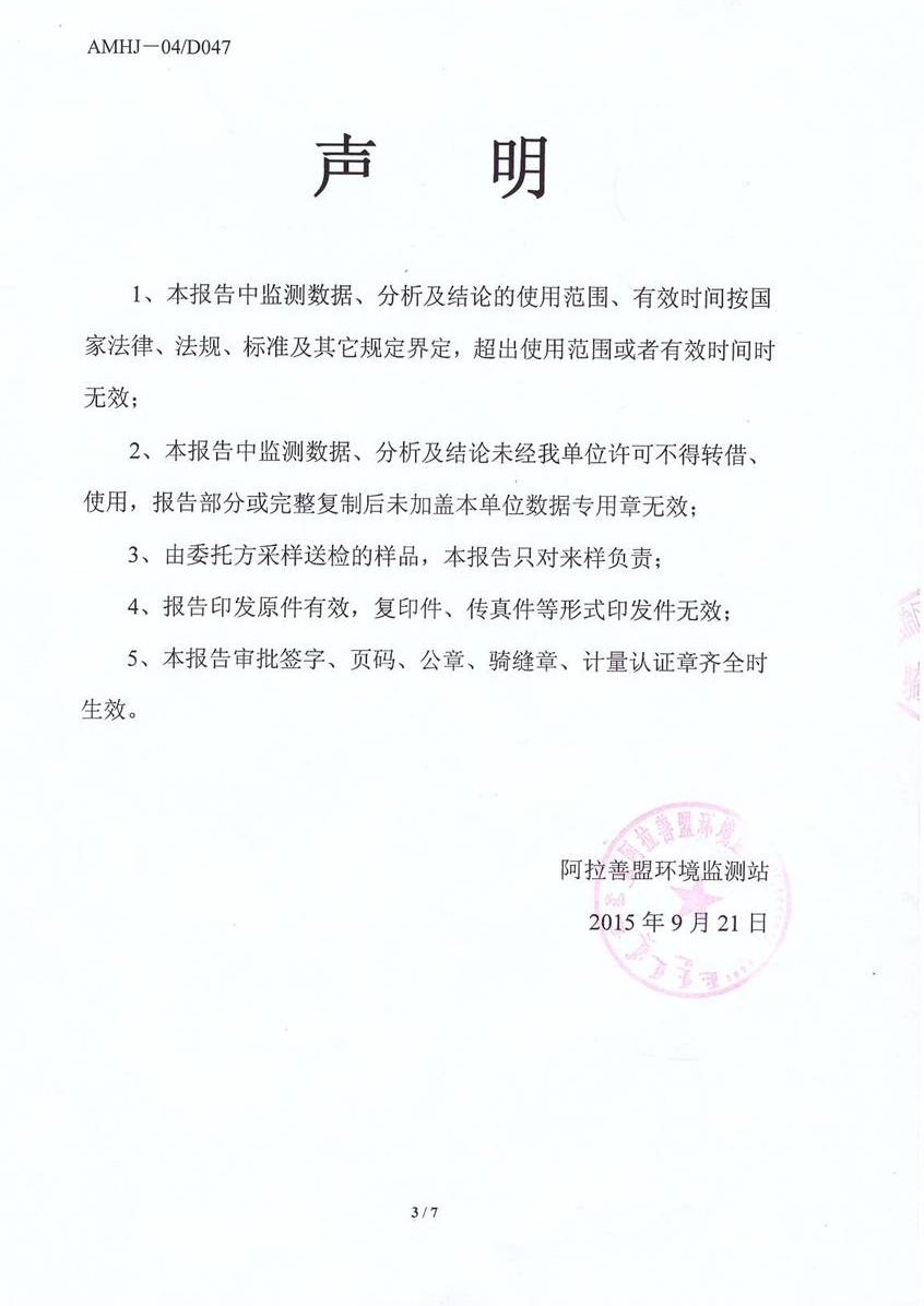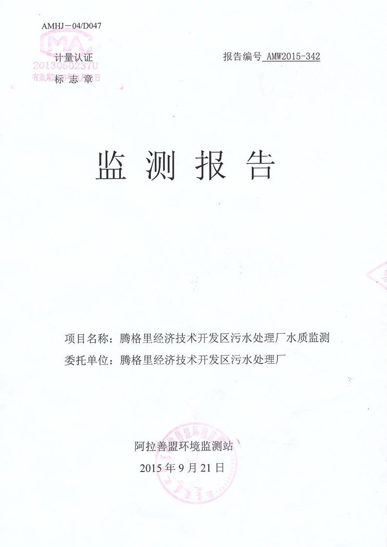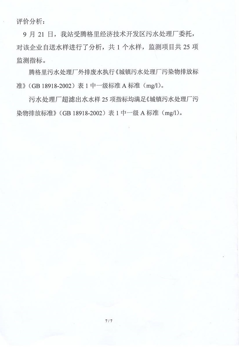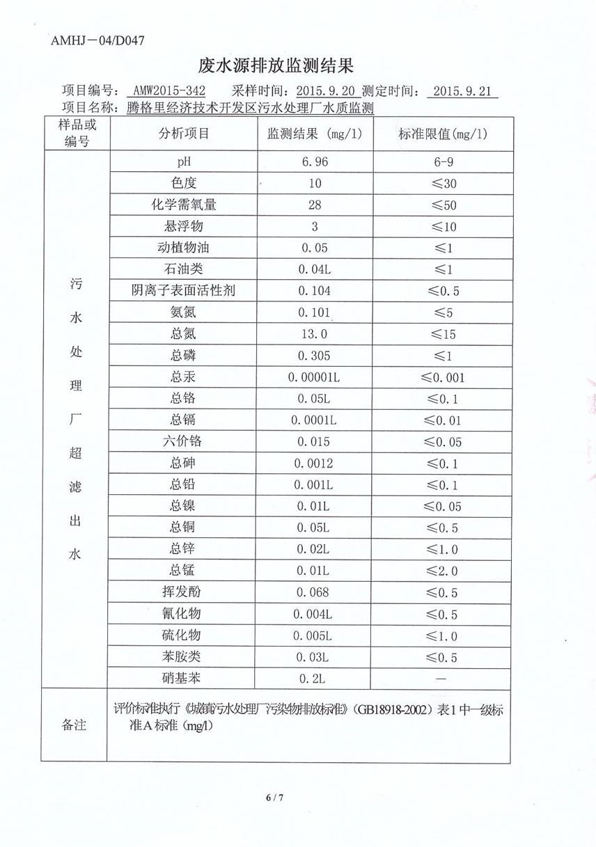2015年9月21日,受騰格里經(jīng)濟(jì)技術(shù)開發(fā)區(qū)污水處理廠委托,阿拉善盟環(huán)境監(jiān)測站對園區(qū)內(nèi)水廠出水水樣進(jìn)行分析,出具水質(zhì)監(jiān)測報告,報告顯示,騰格里污水處理廠外排廢水執(zhí)行《城鎮(zhèn)污水處理廠污染物排放標(biāo)準(zhǔn)》(GB18918-2002)表1中一級標(biāo)準(zhǔn)A標(biāo)準(zhǔn)(mg/l)。污水處理廠超濾出水水樣25項指標(biāo)均滿足《城鎮(zhèn)污水處理廠污染物排放標(biāo)準(zhǔn)》(GB18918-2002)表1中一級標(biāo)準(zhǔn)A標(biāo)準(zhǔn)(mg/l)。